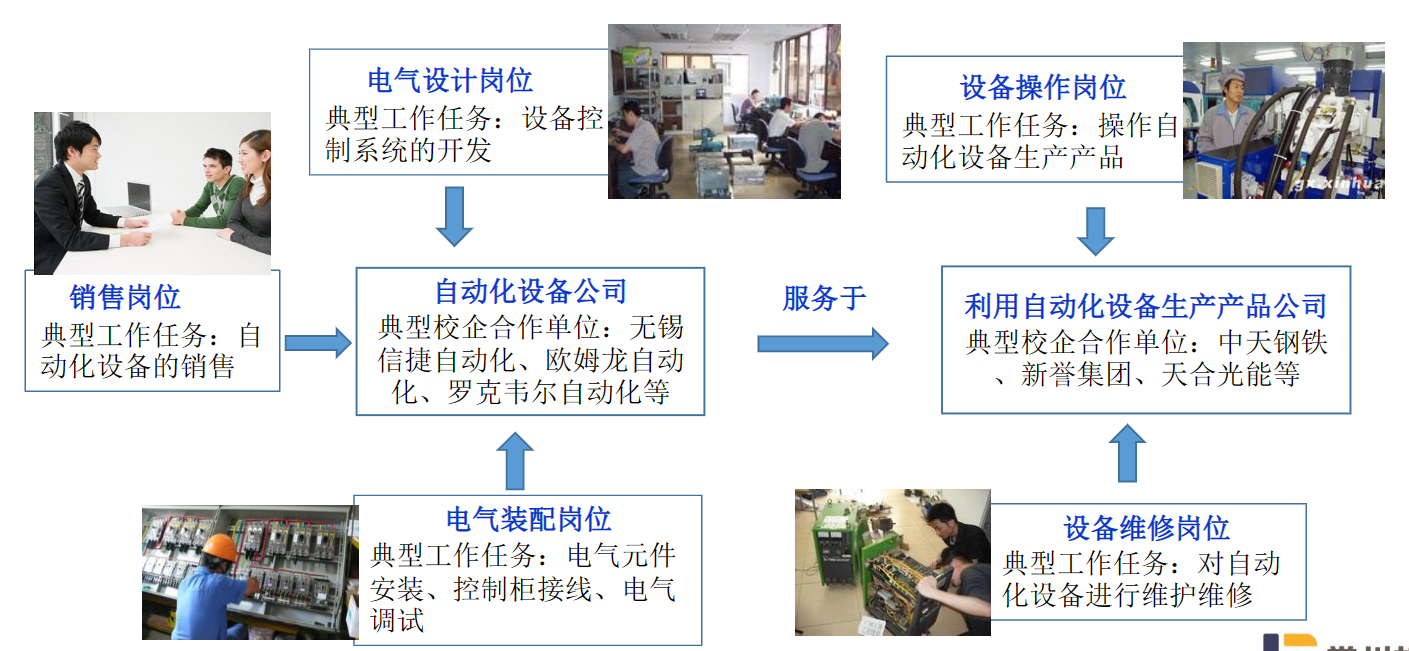 面向电气自动化设备公司、利用自动化设备生产产品公司,从事自动化设备电气设计、自动化设备电气装配、自动化化设备的销售、自动化设备的操作、自动化设备的维修维护等工作。