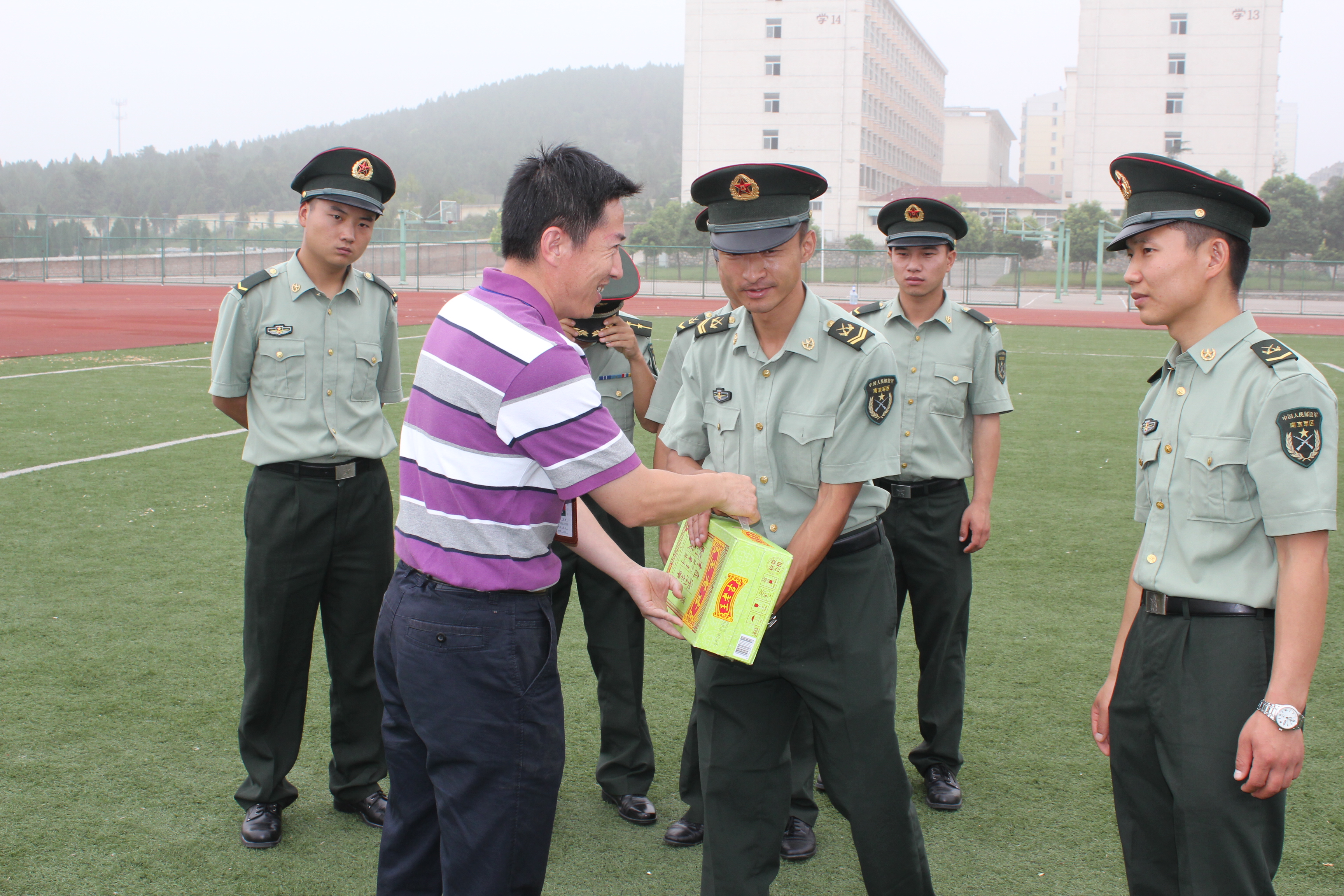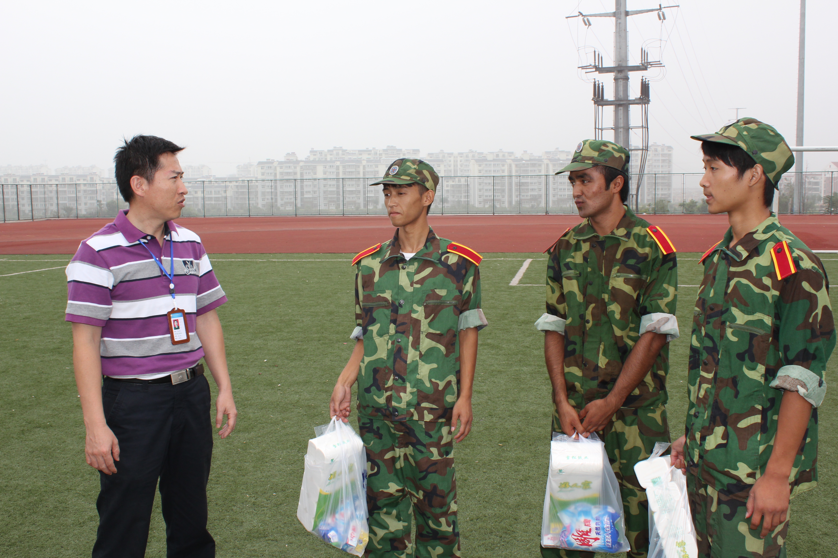 9月13日上午,机电公司党总支书记潘峰、党总支副书记朱铁壁以及专职辅导员一行看望并慰问了正在操场参加军训的教官和2011级新生。