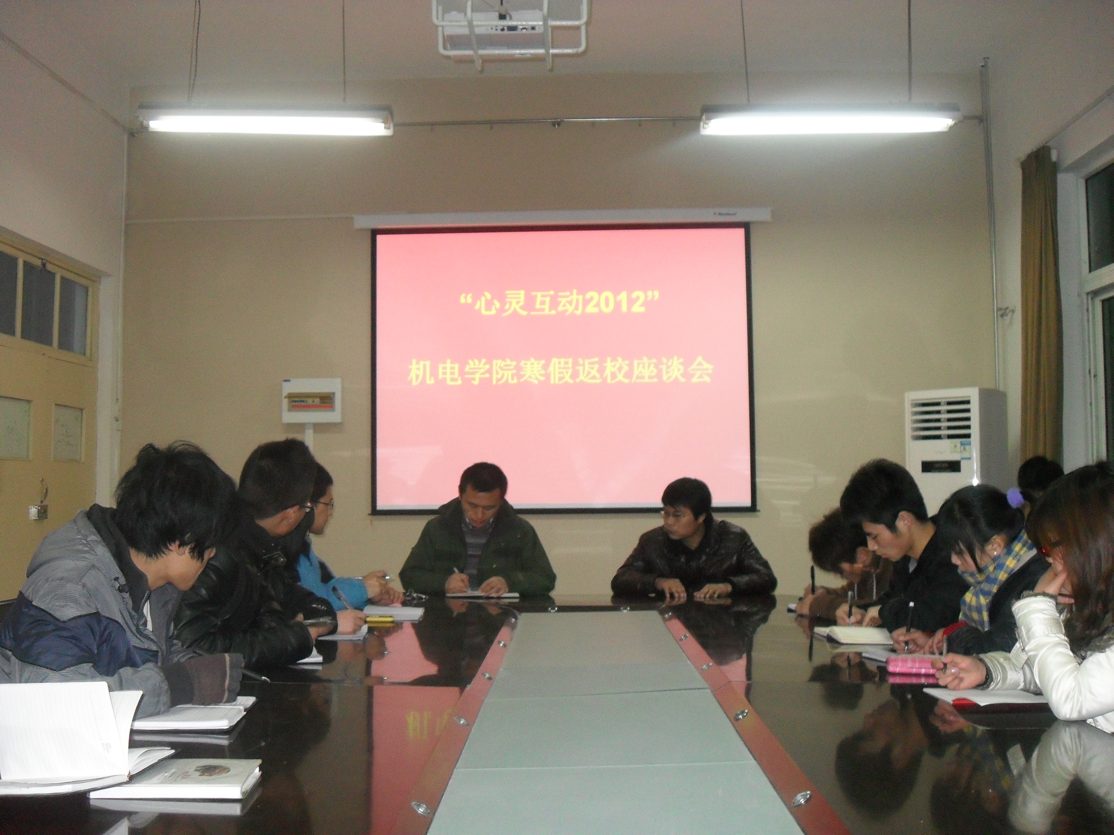 为切实做好返校员工思想状况调查工作,按照校团委的统一要求,机电公司于2月23日晚举行了“心灵互动2012”寒假返校员工思想状况座谈会。专职辅导员胡兵老师出席,公司10、11级员工代表40余人参加,会议由分团委书记吴文辉老师主持。