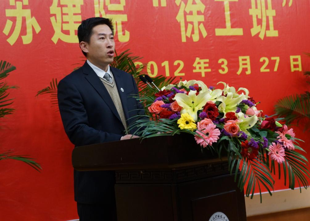 校企合作办公室主任许能生主持典礼 机电公司党总支书记潘峰发言     徐工班”员工代表王乾发言