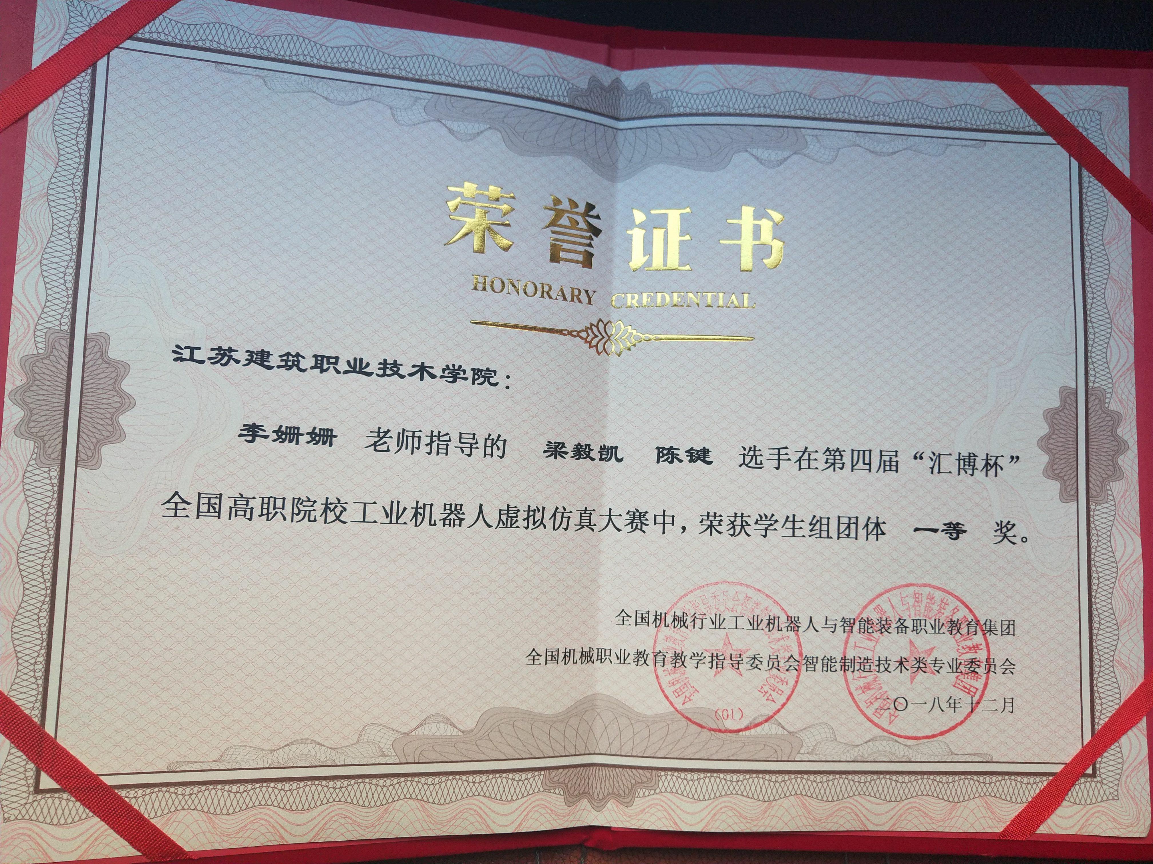 第四届“汇博杯”全国高职院校工业机器人虚拟仿真大赛于12月26日到29日在江苏省常州市举行,公司伟德bevictor派出由李姗姗老师、机器人17班陈键、梁毅凯组成的3人组成的师生团队参加工业机器人系统虚拟调试赛项的比赛。他们积极学习比赛相关知识,积极备战,最终在比赛中取得了一等奖的好成绩。