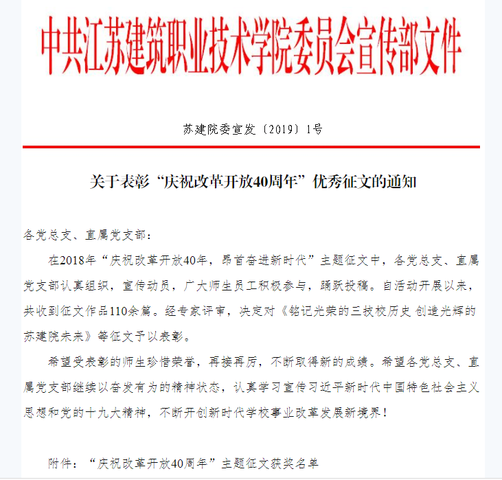 热烈祝贺公司师生在公司“庆祝改革开放40周年”征文活动中,获得较好成绩!其中,邵明颖老师《建院梦与我的十年》获得一等奖;马博《奋进新时代,共筑中国梦》、王青青《改革开放四十年来的苏建院》、周仔航《改革再出发,筑梦新征程》、阮晨鹏《风雨共济40年》获得二等奖;胡志阳《四十年的改革开放四十岁的母校》、余飞飞《改革之变,变在身边》、付善腾《我眼中的改革开放40年》、徐亚臣《庆祝改革开放40周年》获得三等奖。