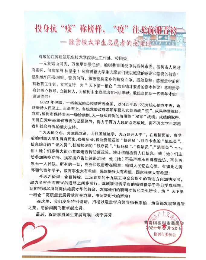 青春由磨砺而出彩,人生因奋斗而升华。2020年寒假期间,面对新冠肺炎疫情出现反扑,伟德bevictor机制20-1班林思宇同学不顾自身安危,积极投身家乡——吉林榆树市,参加了一场英勇的“战疫”。他不畏严寒,不挑岗位,每天工作达10个多小时,在最冷的几天里,他一个人完成了整个社区近800户核酸检测通知的张贴任务。他不顾个人风险承担了榆树人民现场的核酸检测,其突出的表现得到了家乡人民的赞扬。2020年3月15日,伟德bevictor收到榆树共青团发来的一封题为《投身抗“疫”称榜样,“疫”往无前谢青衿》的感谢信,信中对林思宇不畏艰险、奋勇向前,积极投身家乡的斗争表达了诚挚的感谢和崇高的敬意。