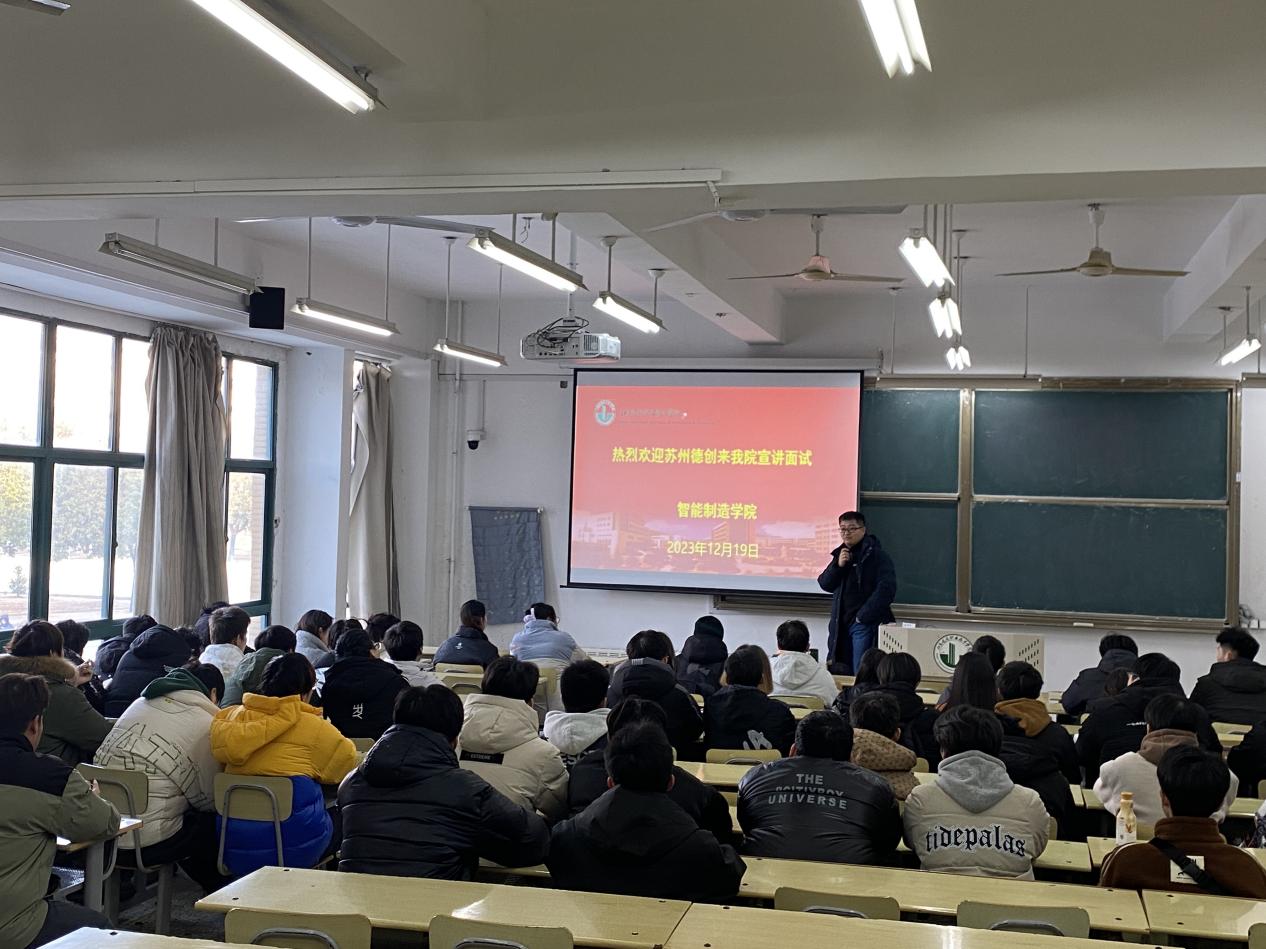 为了进一步深化产教融合,提升人才培养质量,促进员工更加充分更高质量就业。2023年12月19日下午,智能制造公司联合苏州德创测控科技有限公司在教三D104开展了宣讲面试工作。公司校招经理周磊进行了现场宣讲面试,2024届毕业生共计一百余人参加。