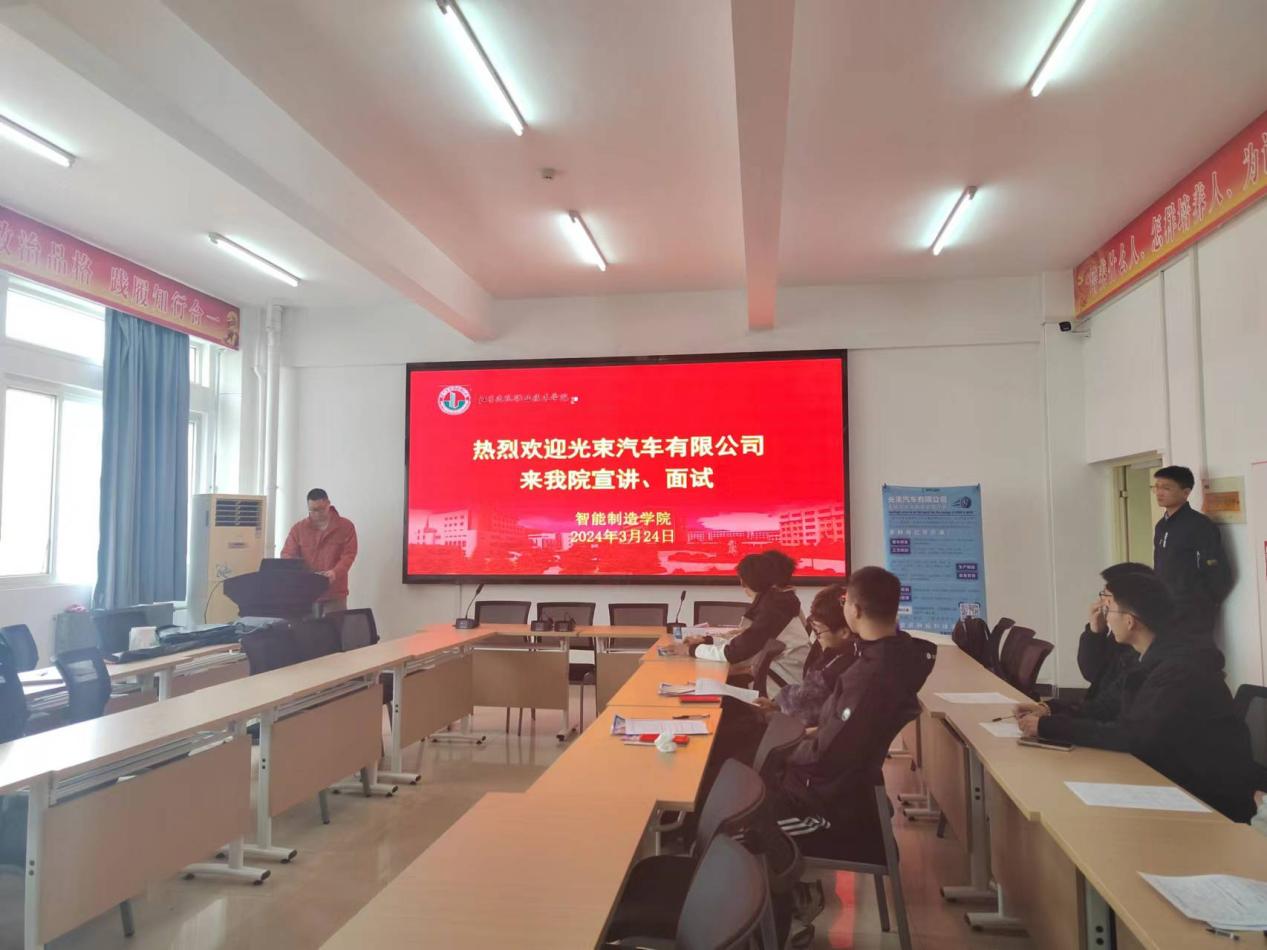 2024年3月24日下午两点,光束汽车有限公司来公司宣讲并选拔优秀毕业生,宣讲会在第一实训楼504举行,部分优秀毕业生参加选拔、面试。