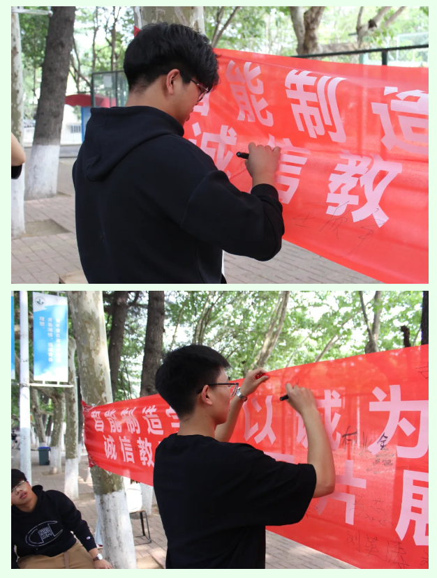 在活动现场,同学们深刻领悟到诚信在资助过程中的核心地位,它如同指引灯,不可或缺。紧接着,他们逐一在横幅上签下自己的名字,横幅上赫然写着“以诚为美,诚信志远”。每一个签名都代表着他们对诚信的坚定承诺,每一次落笔都凝聚着他们恪守诚信的庄重誓言。这一庄严的仪式,不仅彰显了同学们对诚信的坚守,更传递出他们对于诚信价值观的尊重和追求。