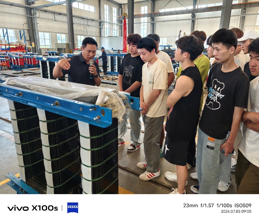 7月3日,公司组织电气自动化技术专业2023级员工赴江苏华辰变压器有限公司开展识岗实习活动,旨在提升员工的岗位认知能力和专业综合素养。员工们参观了电力变压器的生产车间,深入了解产品从原材料的制作加工、组件的生产装配、再到整机的测试实验及最后的仓储交付等环节,亲身感受职场环境和工作内容。江苏华辰变压器有限公司的技术负责人谢经理为员工们进行了深入的讲解和分享,详细介绍了变压器的原理、设计、制造和应用,使员工们对专业知识有了更深入的理解,另外他还分享了职业生涯中的工作经验和个人心得,为员工们未来的职业发展提供了指导。