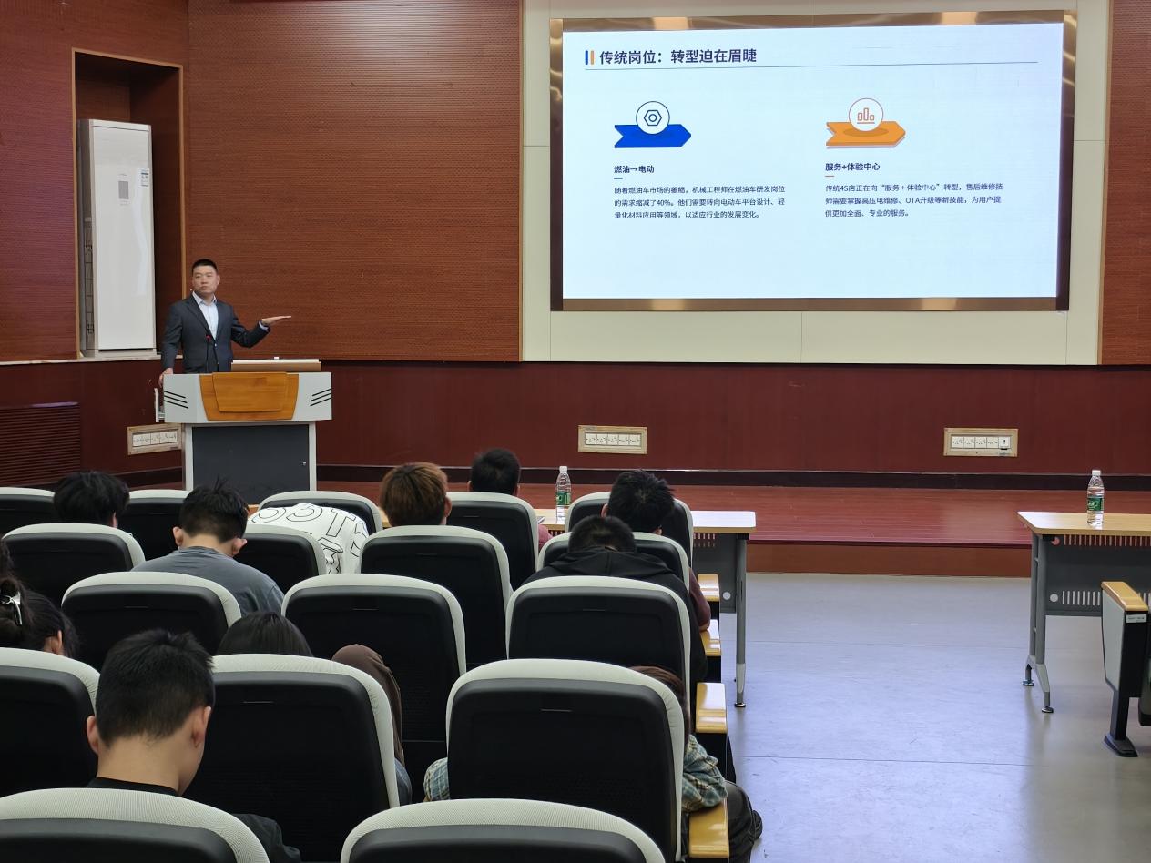开幕式结束后,新能源汽车车展在公司八一广场举行,新能源汽车展吸引师生驻足。比亚迪、蔚来、乐道等品牌展出最新车型,技术人员现场讲解智能驾驶技术,并提供模拟体验与试驾服务。当日下午,智能驾驶与行业趋势主题讲座在翼创学堂举行。徐州保时捷中心总经理魏大超以《智能驾驶技术的现状与未来》为题,剖析了自动驾驶技术的突破方向;徐州好德宝汽车销售服务有限公司总经理包超围绕《汽车行业的发展趋势与就业前景》,为学子们勾勒出新能源与智能制造领域的职业蓝图。互动环节中,员工踊跃提问,企业高管现场答疑并分享职场经验。